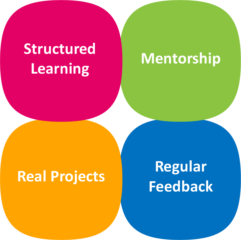 As a RISER, you move through a carefully designed journey that balances learning with application. Structured modules strengthen core skills, while mentorship from experienced professionals provides guidance and perspective. Hands-on projects tied to real business needs allow RISERs to apply what they learn, supported by regular feedback and reflection to encourage continuous improvement.